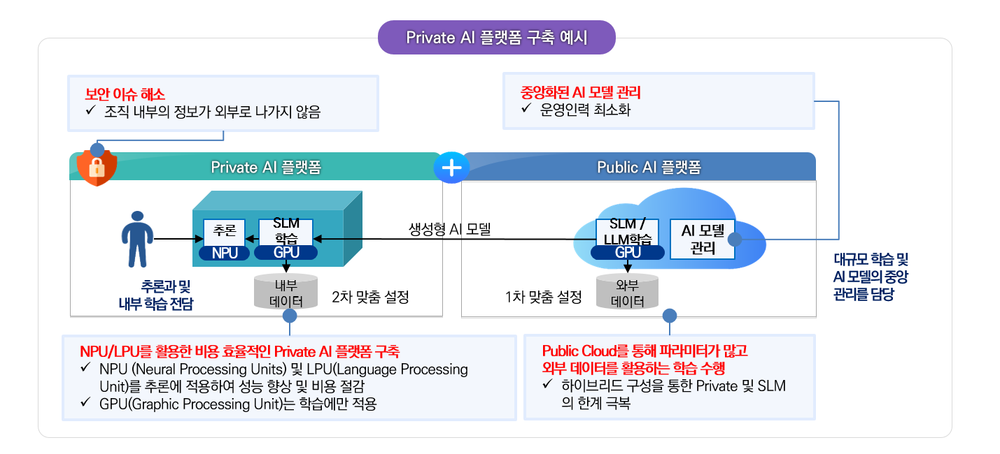 금융기관은 고객정보, 내부 정책, 업무절차 등 민감한 데이터를 다루는 특성상 공개형 생성형 AI 서비스(GPT 등)를 직접 사용하는 데에 보안·규제상의 한계가 있습니다. 이에 따라 금융기관 전용의 Private LLM(대형 언어 모델) 플랫폼을 구축하여, 보안성과 전문성을 갖춘 고도화된 언어 AI 서비스를 사내에서 직접 운영하는 것이 요구되고 있습니다.