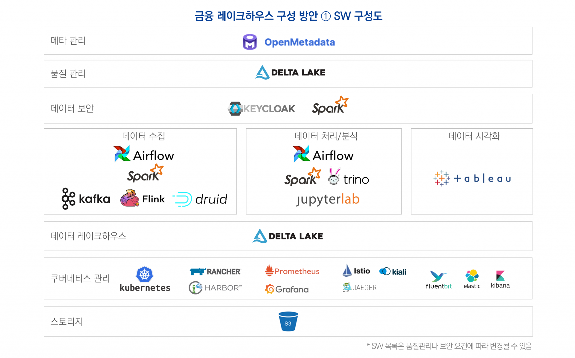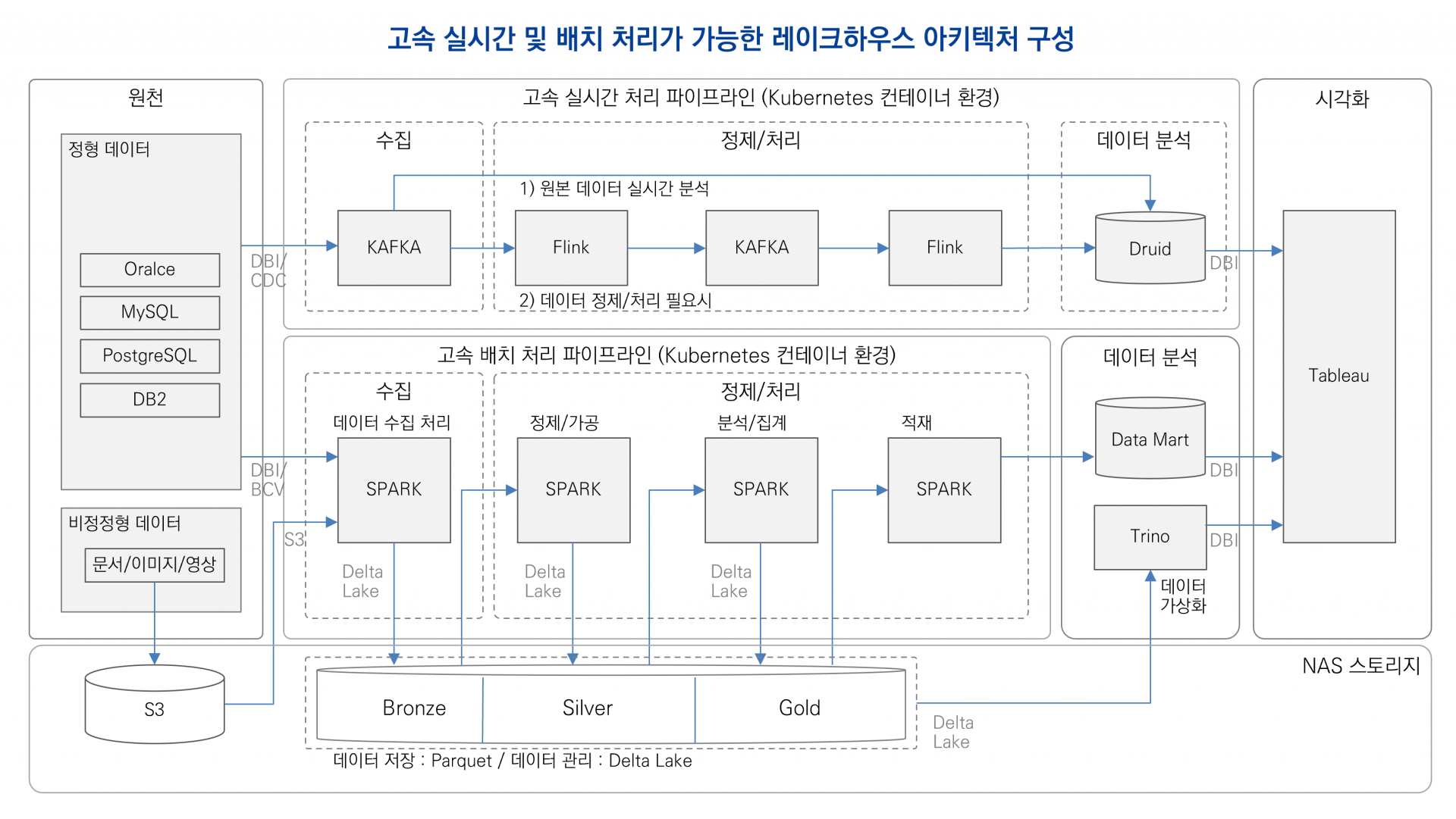 - Parquet 포맷, Delta Lake 기반 데이터 저장소 + Spark, Trino의 병렬 분석 엔진