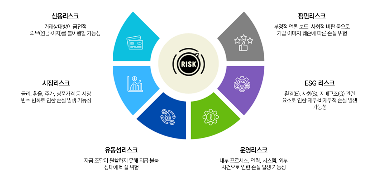 | 평판리스크 | 부정적 언론 보도, 사회적 비판 등으로 기업 이미지 훼손에 따른 손실 위험 | | |