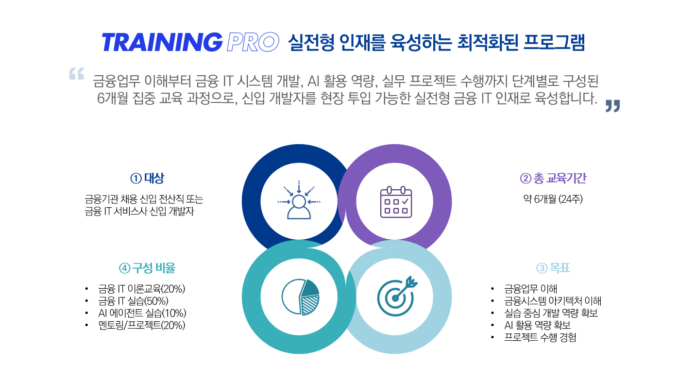 | 17~20 | 금융 IT 전문가 멘토링 기반 실전 프로젝트 | 프로젝트 기획~구현, 연계 인터페이스 개발, 전문가 멘토링, 프로젝트 발표 |